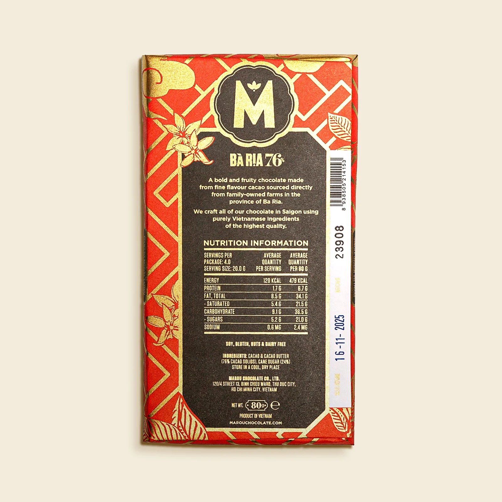 A bold and fruity chocolate made from Trinitario cacao sourced directly from family-owned farms in the province of Ba Ria