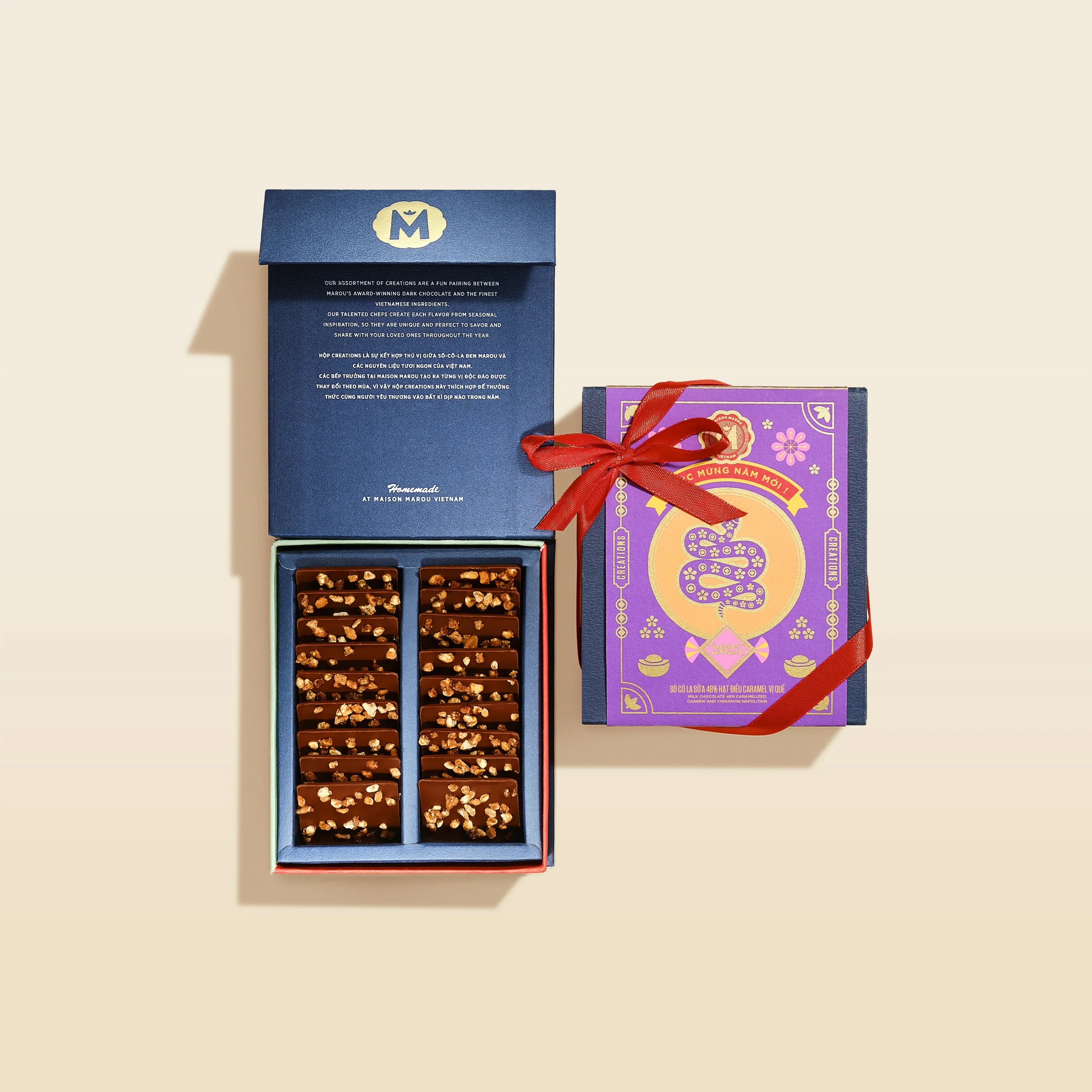 Warm your senses with this 48% dark milk chocolate. A crunchy embrace of caramelized cashews meets the comforting aroma of cinnamon—a Tết treat crafted to delight.