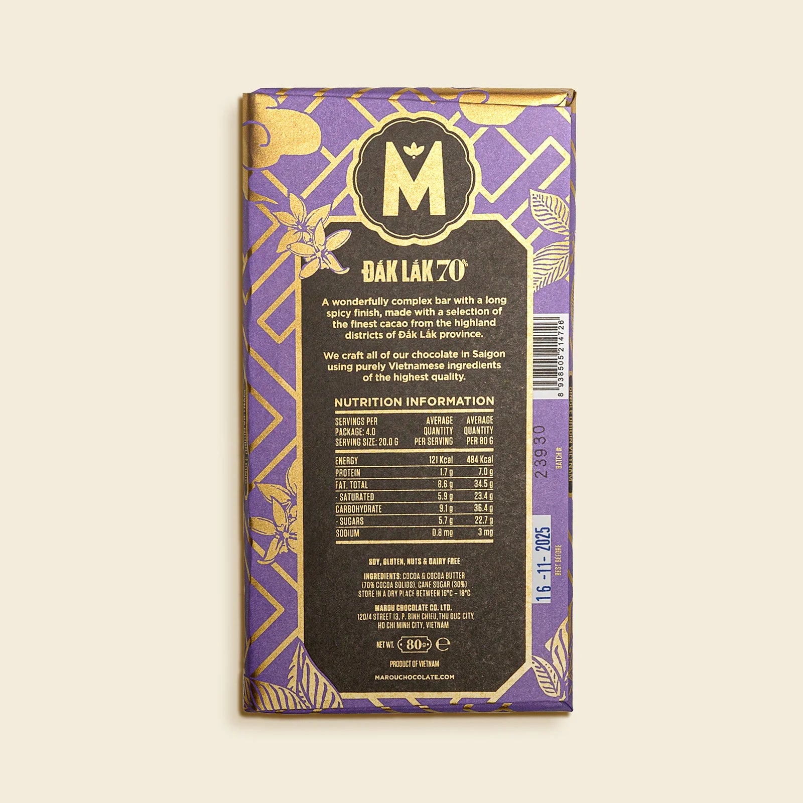 A wonderfully complex bar with a long spicy finish, made with a selection of the finest cacao from the highland districts of Dak Lak province.