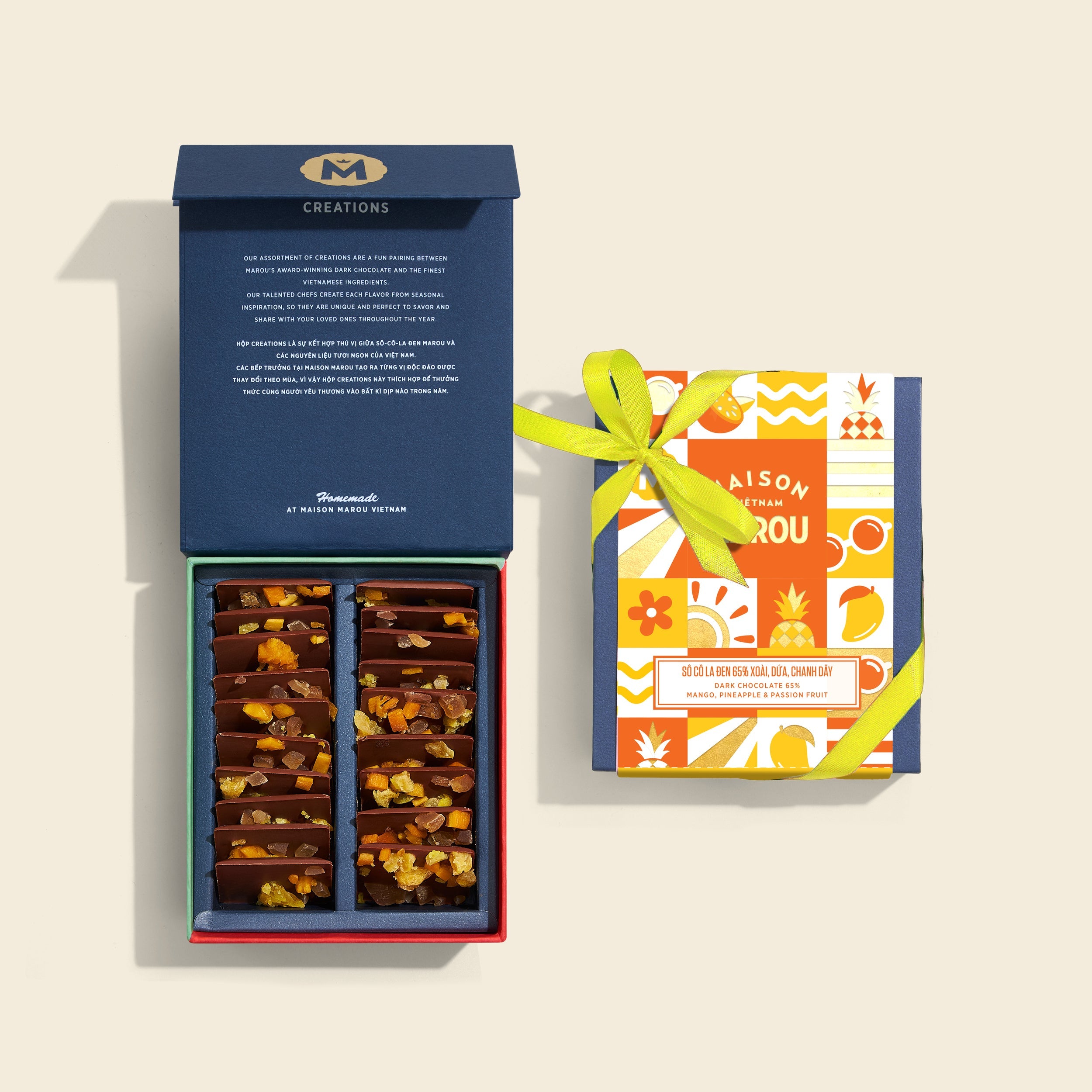 For these napolitain-shaped creations, our 65% dark chocolate is carefully tempered and molded into thin squares. Dried mango, pineapple, and passion fruit are cut and evenly distributed over the chocolate before it sets, allowing each piece to capture a balanced mix of fruit and chocolate.