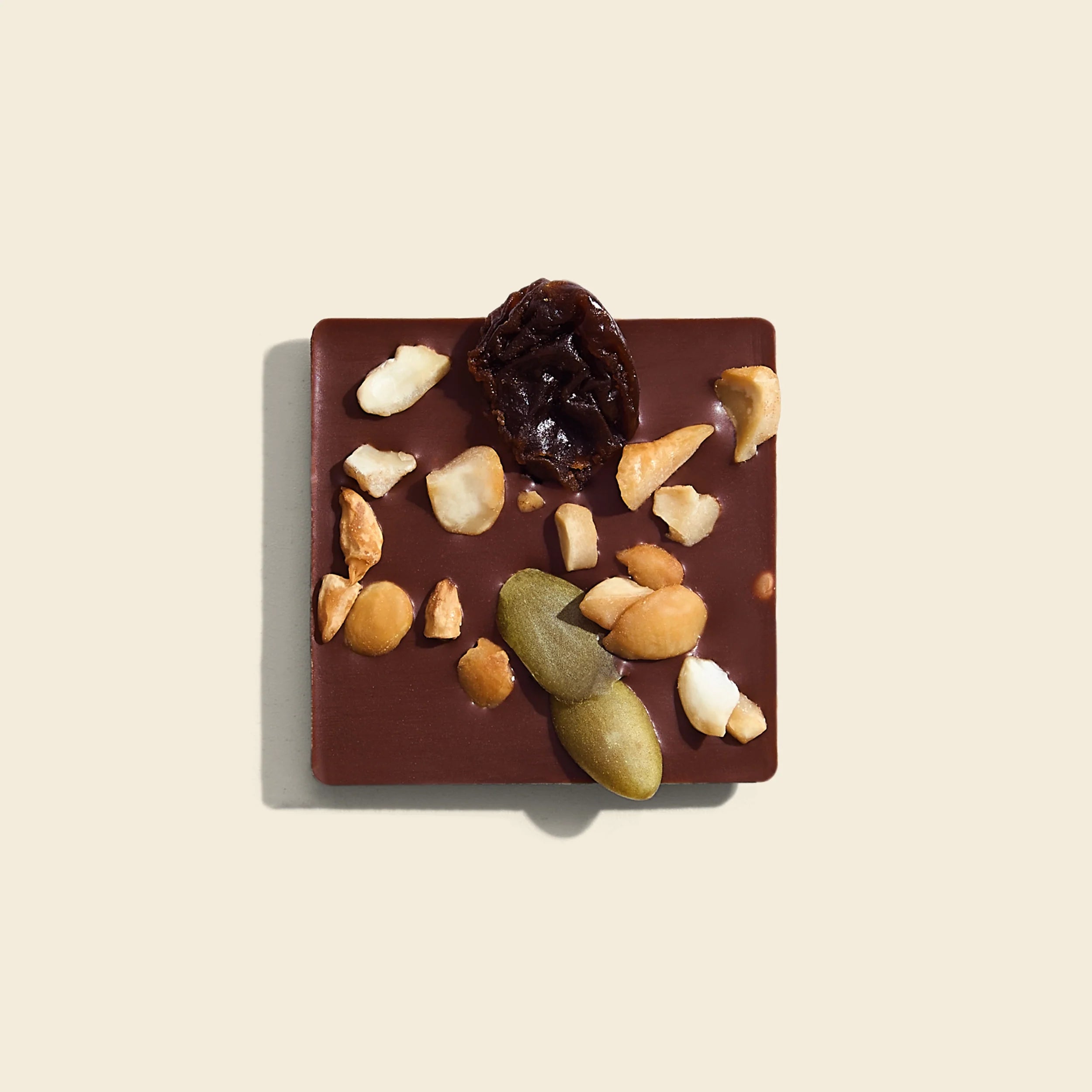 Our 48% milk chocolate is tempered and poured into mendiant molds to create a thin square. Pieces of dried mango, pumpkin seeds, and raisins are carefully arranged by hand on the surface before the chocolate sets.