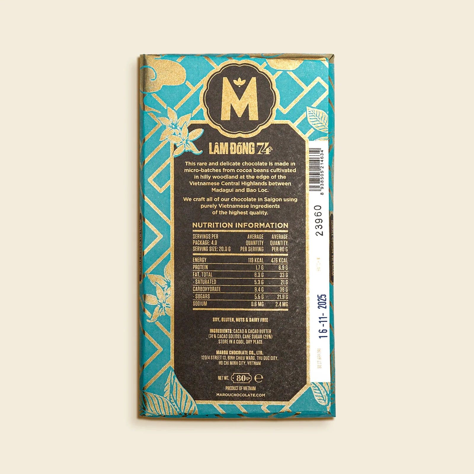 This rare and delicate chocolate is made in micro-batches from cocoa beans cultivated in hilly woodland at the edge of the Vietnamese Central Highlands between Madagui and Bao Loc, Lam Dong.