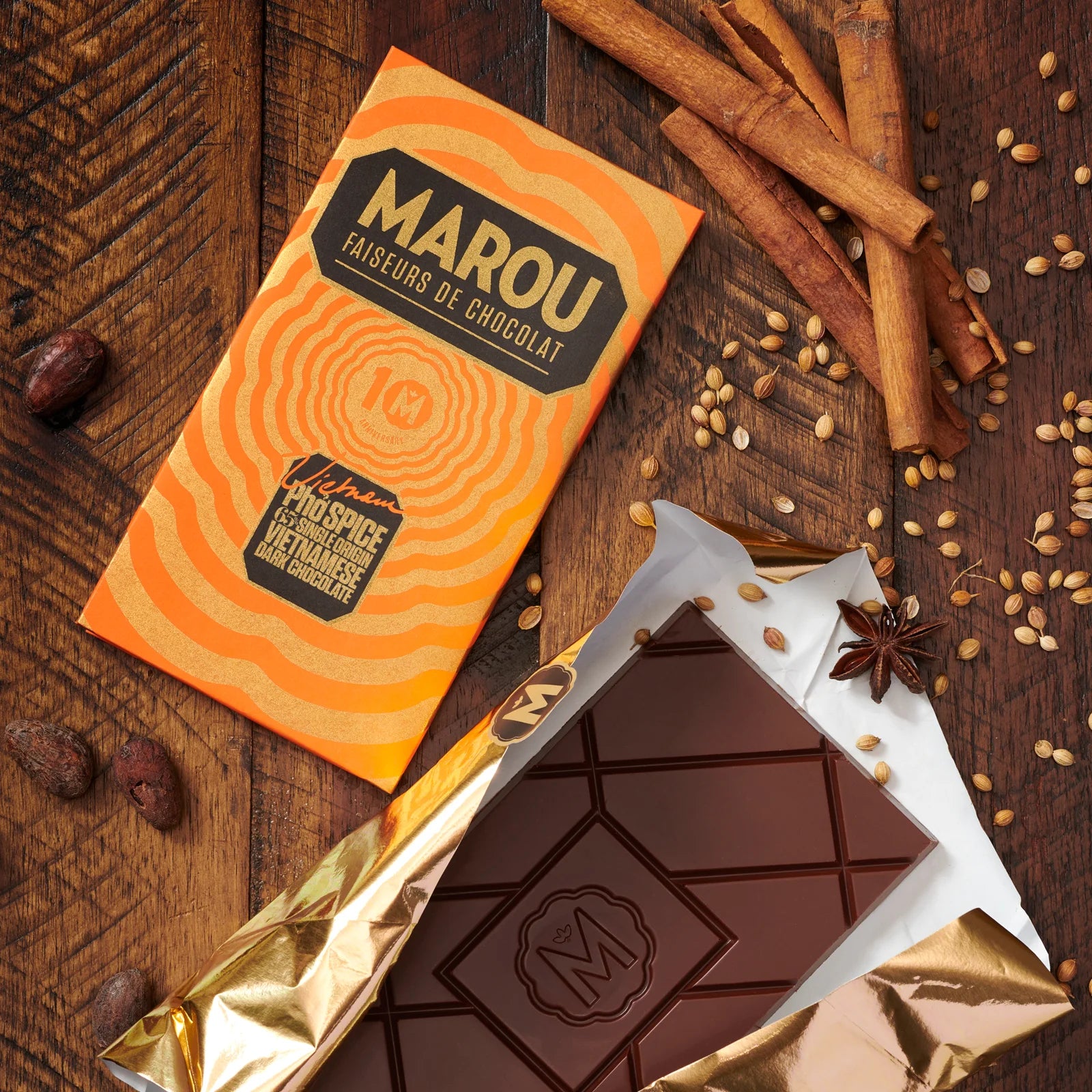 Marou celebrates ten years of bringing award-winning Vietnamese chocolate to the world. We mark this milestone by blending the fragrant spices that are significant to the taste of traditional Pho with our signature single origin dark chocolate. Enjoy our quintessential ode to Vietnam.
